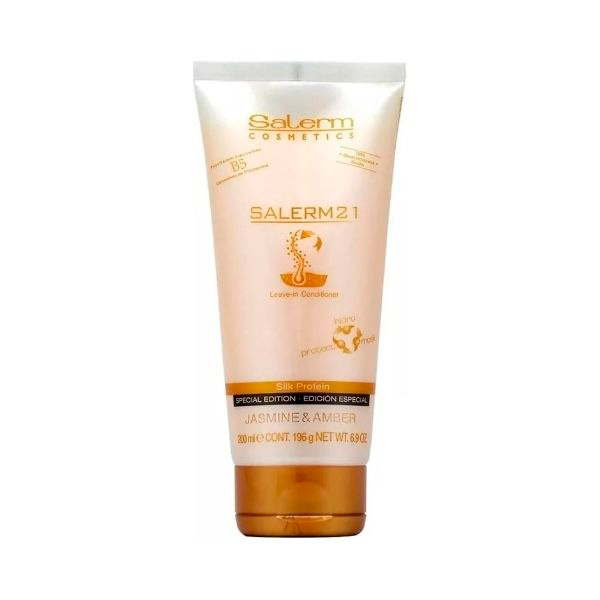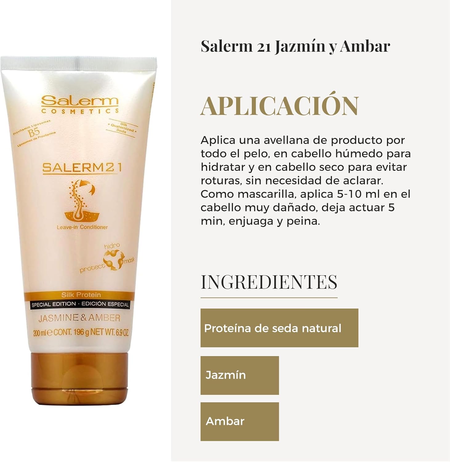 Recupera la suavidad y brillo de tu cabello con Salerm 21 Jazmín y Ámbar, el tratamiento hidratante intensivo que nutre en profundidad y protege desde la primera aplicación. Su fórmula exclusiva, enriquecida con proteínas de seda, convierte el cabello seco o dañado en una melena visiblemente más sana, manejable y luminosa.