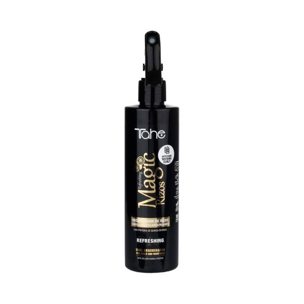 Revitaliza y define tus rizos al instante con el Recuperador de Rizos en Spray Tahe Magic Rizos, enriquecido con proteína de quinoa dorada para hidratar, fortalecer y aportar elasticidad. Este spray refrescante es perfecto para renovar la forma y el brillo del rizo entre lavados, dejando el cabello suave, manejable y sin encrespamiento.