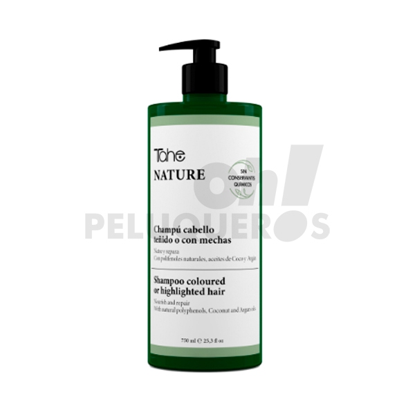 Detalles del producto Champú sin sulfatos cabello teñido o con mechas Nature 750ml. Nutre y repara | Champú que incluye en su composición polifenoles naturales, aceites de Coco, Argán y Geranio.