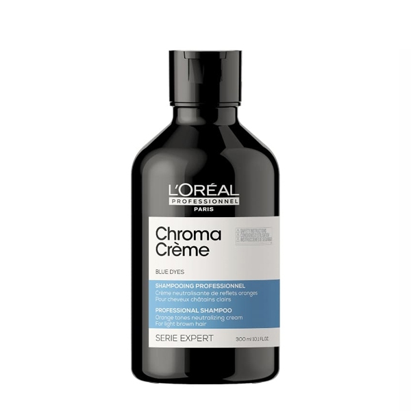 Con Chroma Crème, corrige & cuida tu color, con un resultado un PRO. Chroma Crème es un trio de cremas neutralizantes de color que ofrecen corrección de color instantánea, a la medida para todos los colores de cabello con un máximo cuidado. El cabello recién coloreado contiene tintes de colores primarios. Después de unas lavadas, estos pigmentos desvanecen y reflejos cálidos amarillos, anaranjados o rojizos aparecen. Existe un mito urbano que dice que el champú morado neutraliza todos los tonos cálidos y mantiene el color. La realidad profesional es otra: el champú morado solo neutraliza los tonos amarillos en el cabello rubio. Por esto, para corregir reflejos cálidos indeseados, debes elegir la corrección de color adecuada. Como el azul neutraliza los reflejos anaranjados, elige Chroma Crème azul para los cabellos castaños. Chroma Crème azul instantáneamente neutraliza todos los reflejos anaranjados indeseados, nutre la fibra sin añadir peso, para una corrección de color superior con el máximo cuidado. Chroma Crème es el resultado de una única colaboración de los laboratorios de color y de cuidado capilar de L'Oréal Professionnel en Paris. Juntos, han desarrollado una tecnología exclusiva, combinando pigmentos elaborados por profesionales, para neutralizar todos los reflejos cálidos indeseados, ahora en la fórmula más cuidadosa.