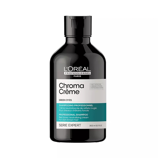 Con Chroma Crème, corrige & cuida tu color, con un resultado un PRO. Chroma Crème es un trio de cremas neutralizantes de color que ofrecen corrección de color instantánea, a la medida para todos los colores de cabello con un máximo cuidado. El cabello recién coloreado contiene tintes de colores primarios. Después de unas lavadas, estos pigmentos desvanecen y reflejos cálidos amarillos, anaranjados o rojizos aparecen. Existe un mito urbano que dice que el champú morado neutraliza todos los tonos cálidos y mantiene el color. La realidad profesional es otra: el champú morado solo neutraliza los tonos amarillos en el cabello rubio. Por esto, para corregir reflejoscálidos indeseados, debes elegir la corrección de color adecuada. Como el verde neutraliza los reflejos rojizos, elige Chroma Crème verde para los cabellos castaños oscuros o negros. Chroma Crème verde instantáneamente neutraliza todos los reflejos rojizos indeseados, nutre la fibra sin añadir peso, para una corrección de color superior con el máximo cuidado. Chroma Crème es el resultado de una única colaboración de los laboratorios de color y de cuidado capilar de L'Oréal Professionnel en Paris. Juntos, han desarrollado una tecnología exclusiva, combinando pigmentos elaborados por profesionales, para neutralizar todos los reflejos cálidos indeseados, ahora en la fórmula más cuidadosa.