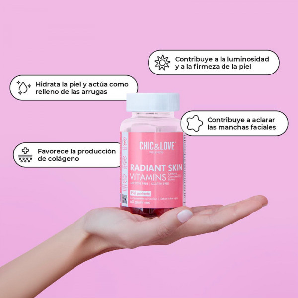 CHIC&LOVE RADIANT SKIN, son unas deliciosas vitaminas para mantener la piel joven, tersa y sin arrugas. Están formuladas con Colágeno Coenzima Q10 Biotina Vitaminas A, E y C.